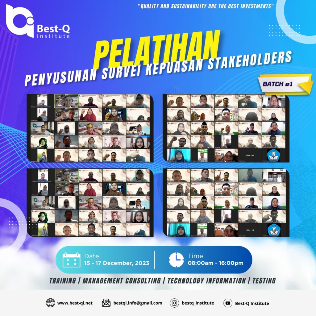 Pelatihan Penyusunan Survei Kepuasan Stakeholders ini diselenggarakan oleh Best-Q institute, yang mana kegiatan pelatihan ini diselenggarakan selama tiga hari yaitu dari tanggal 15-17 Desember 2023 secara Daring melalui Zoom Meating, yang diikutsertakan oleh berbagai Perguruan Tinggi di Indonesia, termasuk LPM STAI Al-Hidayah Bogor juga ikut serta dalam acara tersebut, dengan mengutus Saudara Aforisma Mulauddin, S.H., M.E. selaku Kepala Bidang Pengelolaan Survei Kepuasan Akademik dan Non Akademik. Tetapi bukan saudara Aforisma saya yang hadir dalam acara pelatihan tersebut, tetapi kami juga ikut mengajak kepada para Gugus Mutu Prodi dalam acara pelatihan tersebut dengan cara menampilkannya di layar TV/infokus, agar para Gugus Mutu Prodi juga bisa ikut menonton dan paham teknis penyusunan survei kepuasan ini.
